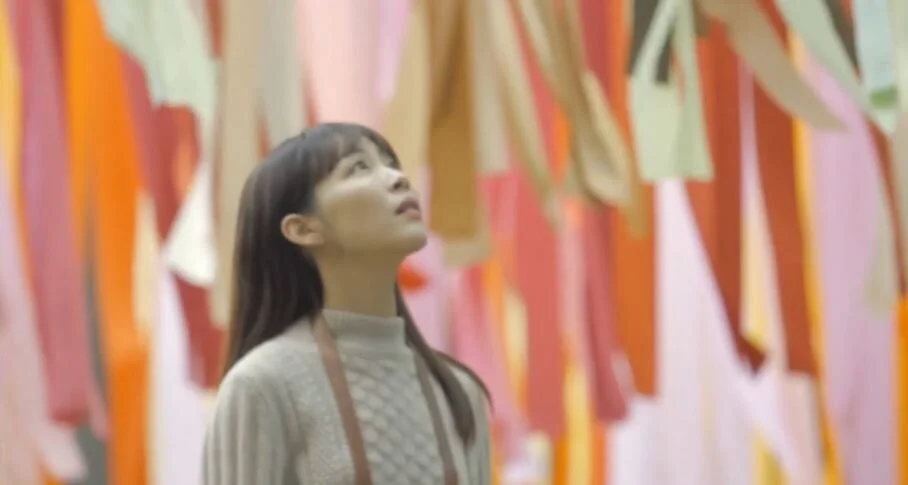 空間を浮かび溢れ出す100色で構成し、場所によって色の材質や形を変化させ、既存空間に色を重ね合わせている。