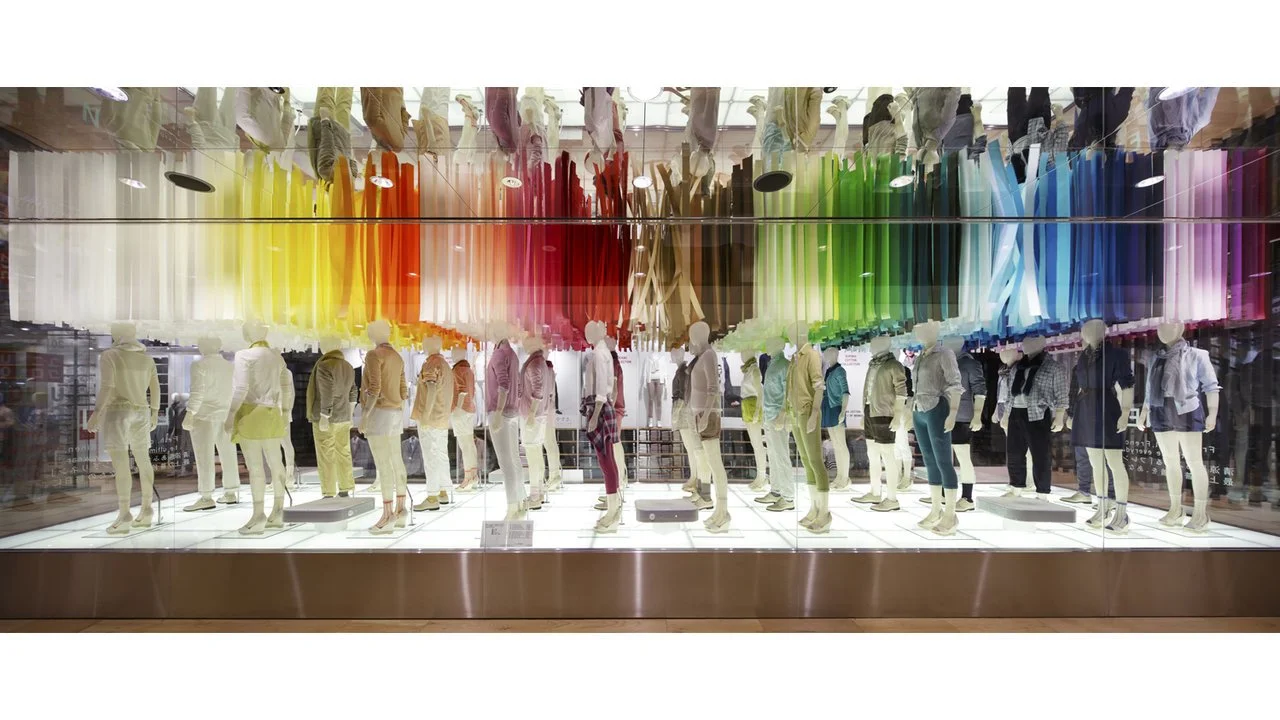サーキュレーターにより揺れ動く色の帯の中で、リネンを着たマネキンが春の訪れを感じさせる。そしてファサードにはガラスケースと同じ100色の正方形が7mの高さまで敷き詰められ、色が春風に舞い上がる様子を表現している。